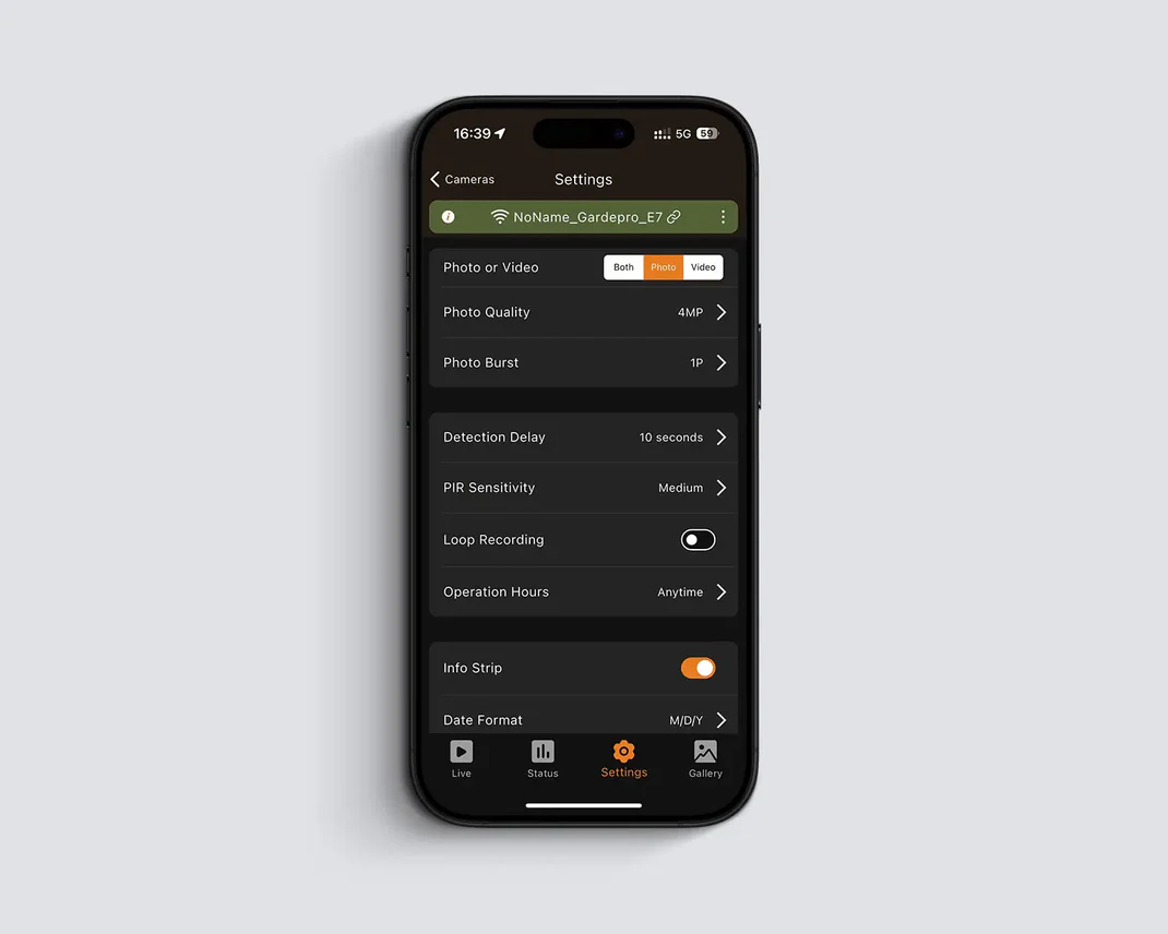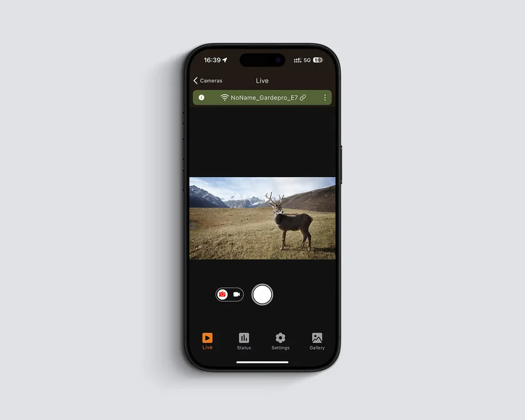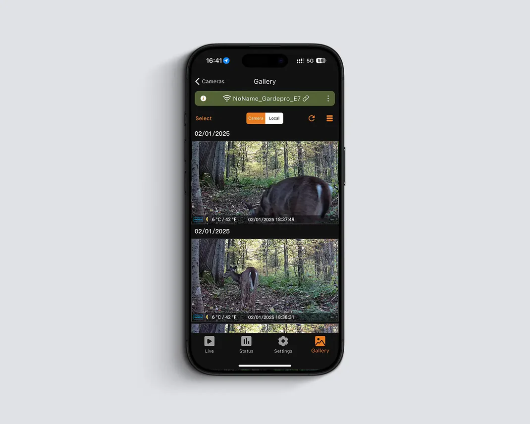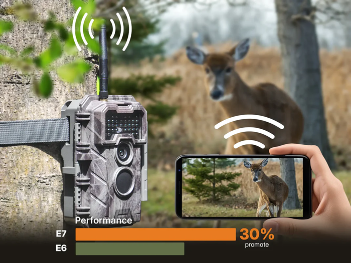 Gardepro E7 iz kamerası, Bluetooth üzerinden kolayca eşleştirme yapmanıza ve WiFi üzerinden iletim yapmanıza olanak tanır, böylece fotoğraflara/videolara doğrudan erişim sağlar ve SD kartı çıkarmadan kamera ayarlarını yapmanıza olanak tanır.